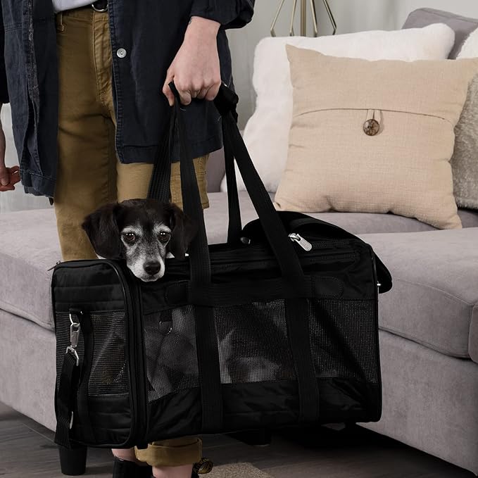 - FITS ON OR UNDER SEATS: Our patented spring wire frame allows the rear end of the carrier to be pushed down several inches, easily fitting in cars and conforming to under-seat requirements of domestic rail travel