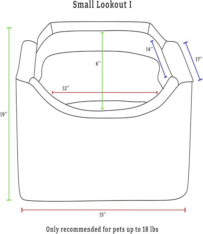 - This dog booster car seat for dogs small 5-15 lbs raises your pup 6” to allow for viewing out of the window. The removable pillow can add additional height if necessary. The enveloping microsuede interior is 12” x 14” and boasts 6” tall sidewalls to secure small breed dogs under 10” in length (like pomeranians, chihuahuas, and yorkies) within the dog car seat. The Lookout dog car seat measures 19″H x 15″W x 17″L and is an ideal back seat or front seat dog car seat, fitting inside a single seat.