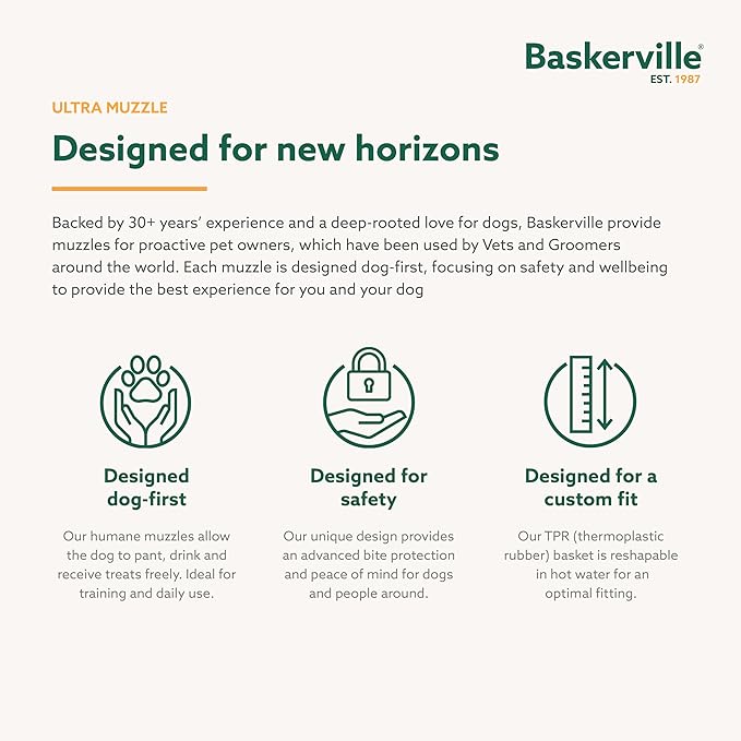 - DOGS CAN PANT AND DRINK: The Baskerville Ultra Muzzle PATENTED HUMANE DESIGN allows dogs to pant (when hot or stressed) and drink. SUITABLE FOR DAILY WALKS and longer periods of wear.