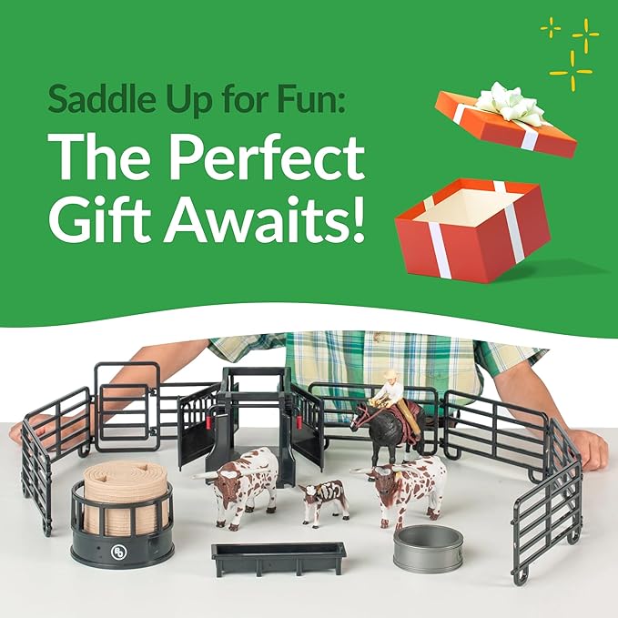 - Durable 16-Piece Farm Playset: Made of our proprietary blend of child-safe plastic that creates durable, lifelike farm animal toys for kids 3-5 years and up. Inside this play figure playset, you'll find farm animal figurines and other accessories like 7-piece corral fencing, a cattle squeeze chute, a longhorn cow and calf pair, a longhorn bull, toy water trough and feed trough, toy cowboy & horse, a toy hay bale, and a toy hay ring.