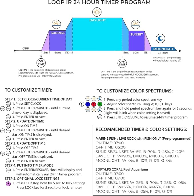 - REALISTIC EFFECTS- From start-up to sundown, the Orbit Marine gradually mimics the effect of a slow sunrise, bright daylight, dimming sunset and moonlight. Built-in lighting programs create a 24-hour natural biorhythmic lighting cycle, while on-demand dynamic weather effects gently roll clouds across your reef.