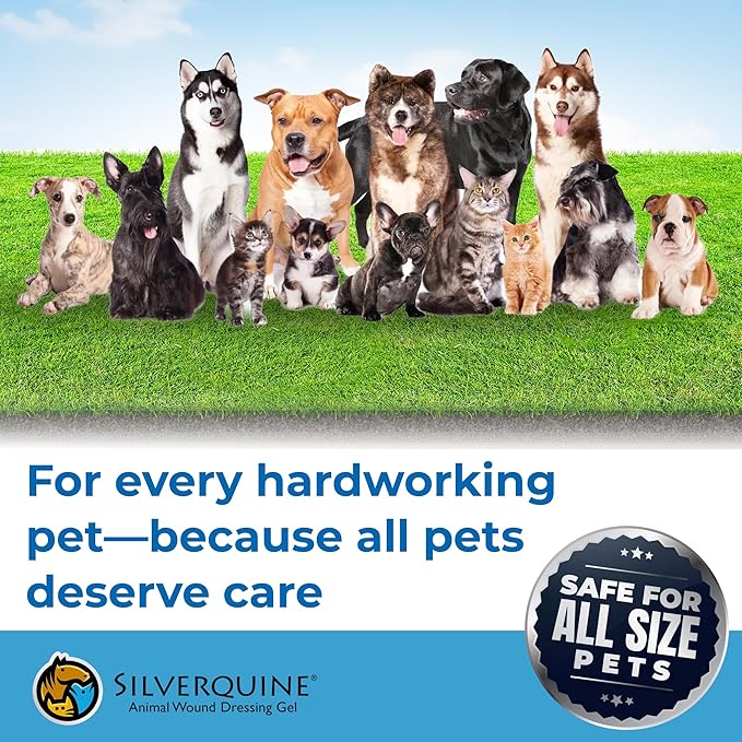 - ENHANCED RESTORATION WITH LONG-LASTING PROTECTION: Silverquine hydrogel provides constant moisture to minimize scabbing and scarring issues. Single application offers 24-72 hour duration. Excellent for dog hot spot gel, cat wound ointment needs, and itch solution for dogs. Easy to clean without sticking to fur or skin. Provides cooling effect for pet emergency situations, reducing pain and burning sensations while promoting natural restoration.