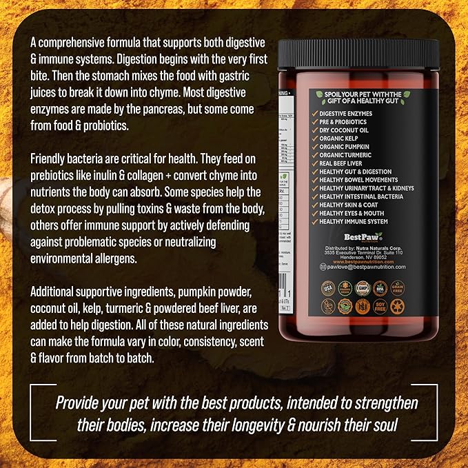 - ONLY FOUND WITH BEST PAW - We took it a paw further. Adding even more vitamins for an immune boost. Organic Coconut Oil, Atlantic Kelp, FOS, Pumpkin Powder, Turmeric and Beef Liver Powder. For dry, itchy skin problems, eye, ear health, and joint health. Natural yeast infections and allergies relief.