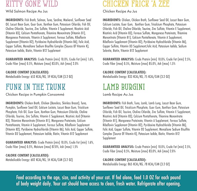 - Kitchen Cuties Variety Pack, (3.2oz Can, Pack of 12) Featuring a variety of wild salmon, cage free chicken, and lamb in a delicious Au Jus. An all natural blend of premium proteins that cat’s can't resist!