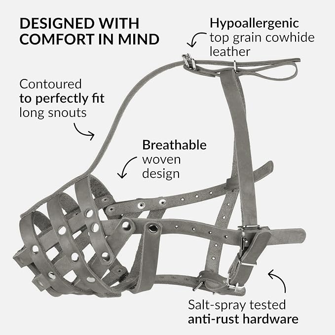 - COMFORTABLE: Our high-quality, handmade leather dog muzzle is skin-friendly. With a cross-weave design, this breathable, durable muzzle is soft on your dog’s fur because your pet’s comfort always comes first.