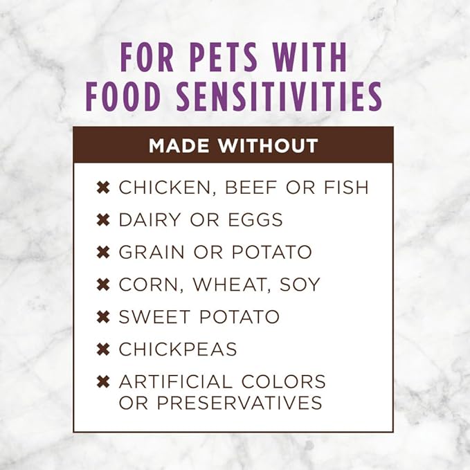 - GRAIN FREE CAT FOOD FOR CATS WITH SENSITIVITIES: Instinct Limited Ingredient cat food is made with 1 protein & 1 vegetable. No grain, dairy, eggs, chicken, beef, fish, sweet potato, potato, chickpeas, corn, wheat, soy, artificial colors or preservatives.
