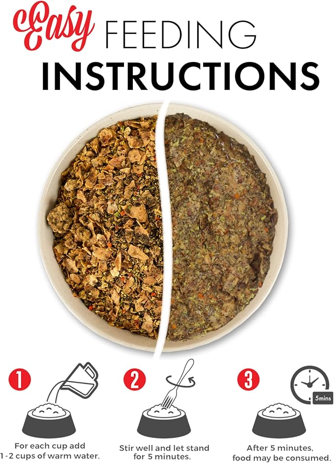 - JUST ADD WATER - For each cup of dog food add 1-2 cups of warm water. Stir well and let stand for 3-5 minutes
