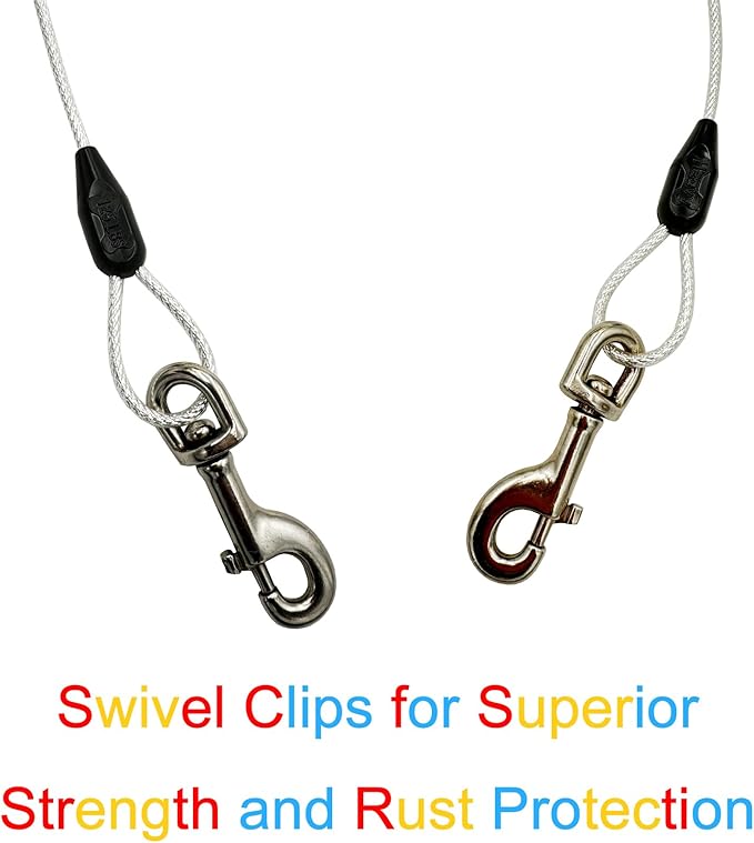- Steel cable and swivel clips for superior strength and durability.