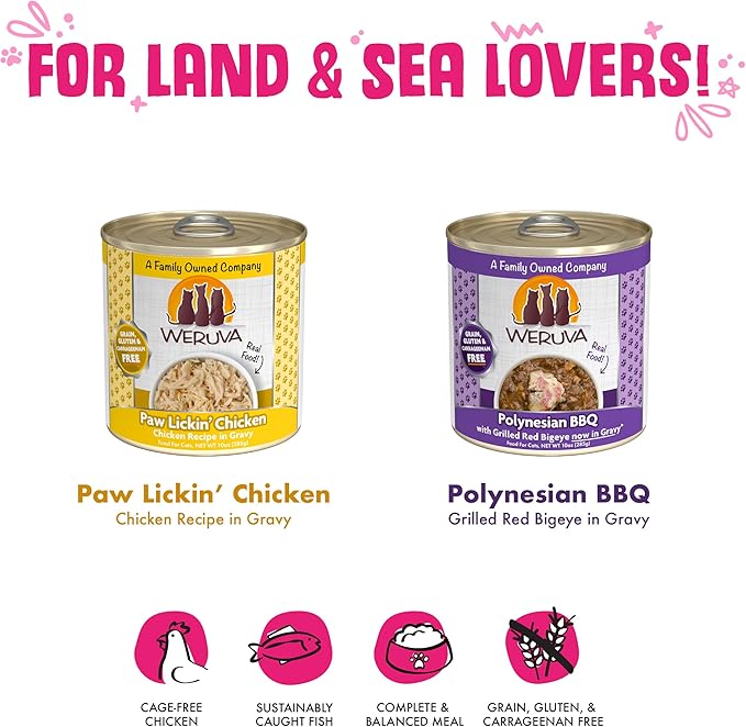 - Wowzer Meowzer Variety Pack (10oz cans, Pack of 12) Our 4 most popular poultry and seafood recipes. Weruva’s official variety pack for multi-cat homes!