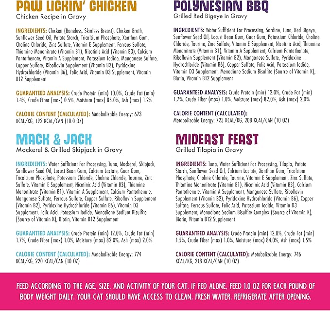- Variety Pack includes 3 cans of each: Paw Lickin’ Chicken, Mideast Feast, Mack & Jack & Polynesian BBQ
