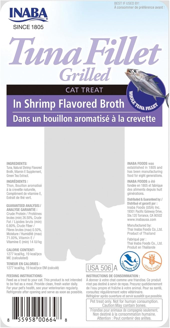INABA Premium Hand-Cut Grilled Tuna Fillet Cat Treats/Topper with Vitamin E and Green Tea Extract, 0.52 Ounces Each, Pack of 6, Shrimp Broth