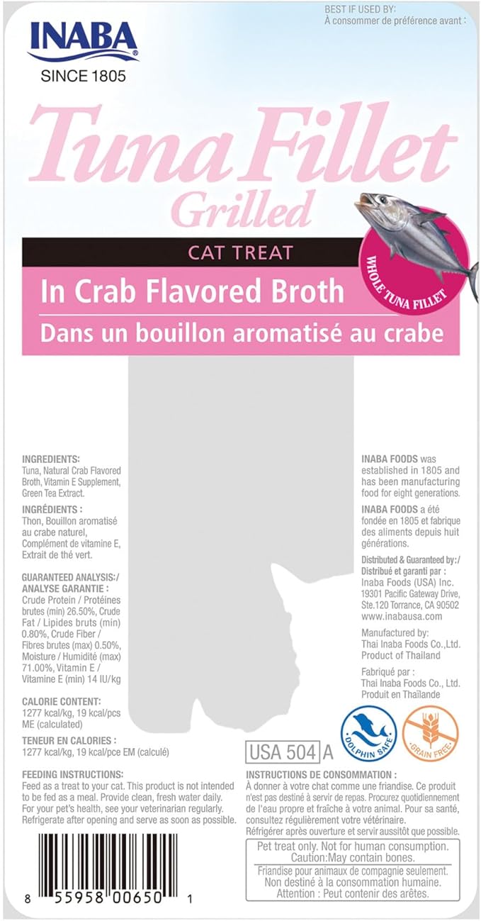 INABA Premium Hand-Cut Grilled Tuna Fillet Cat Treats/Topper with Vitamin E and Green Tea Extract, 0.52 Ounces Each, Pack of 6, Crab Broth