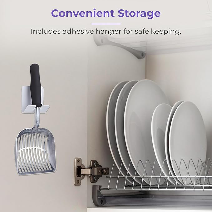 - Convenient Storage: Includes an adhesive plastic hanger for easy storage, allowing you to keep the long handle litter scooper within reach and your space organized when not in use