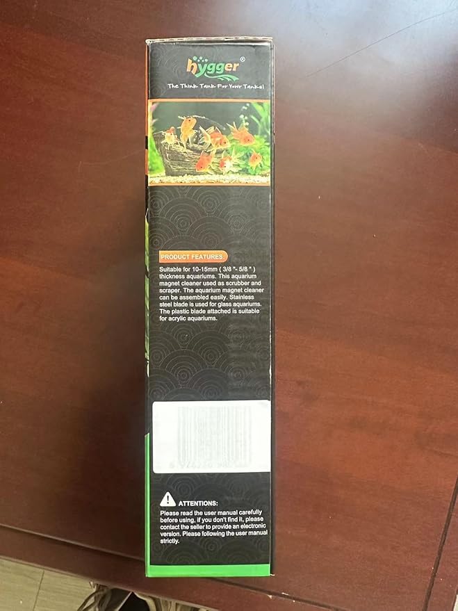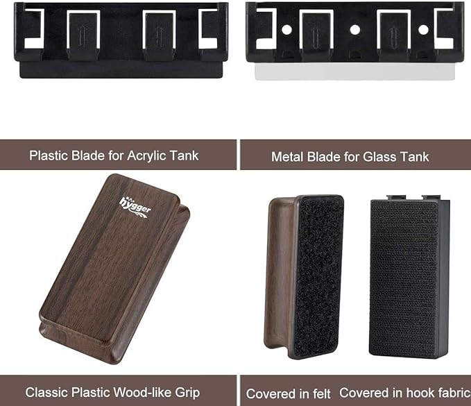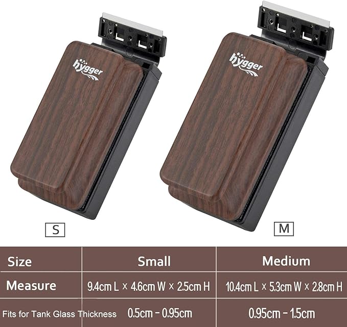 - Powerful Magnet - hygger Aquarium Magnet Cleaner carries so strong magnetism that it sticks tightly on the glass not fall off. This smooth, curved wood-like finish grip is ergonomically designed so it's comfortable to use and let’s you dig in and get the tough spots. The scrubbing pad is covered in hook, velcro-like fabric along with blade to scrape off tough stuff grows on glass