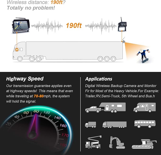 - ★New upgraded wireless backup camera system, with ideal 7inch monitor offers real higher and clearer picture quality 720P, no interference wireless signal and longer transmitting distances good for almost truck, semi-trailer, motorhome, 5th wheels, trailer, RV, Van, SUV, camping car, bus