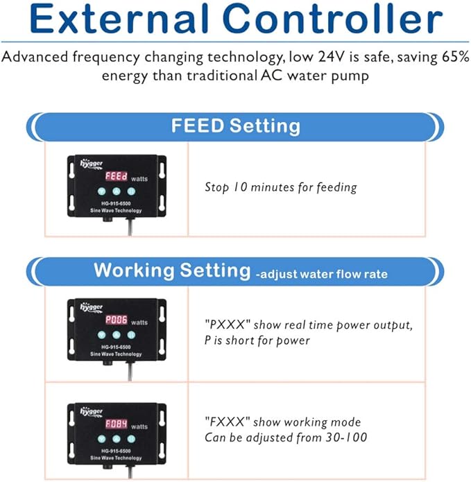 - Easy to Read External Controller-- Build in external controller, easy to operate, offers up to 71 speed setting for you to customize water flow and feeding setting ( turn the pump off for 10 minutes for feeding). Easy to read red Led display
