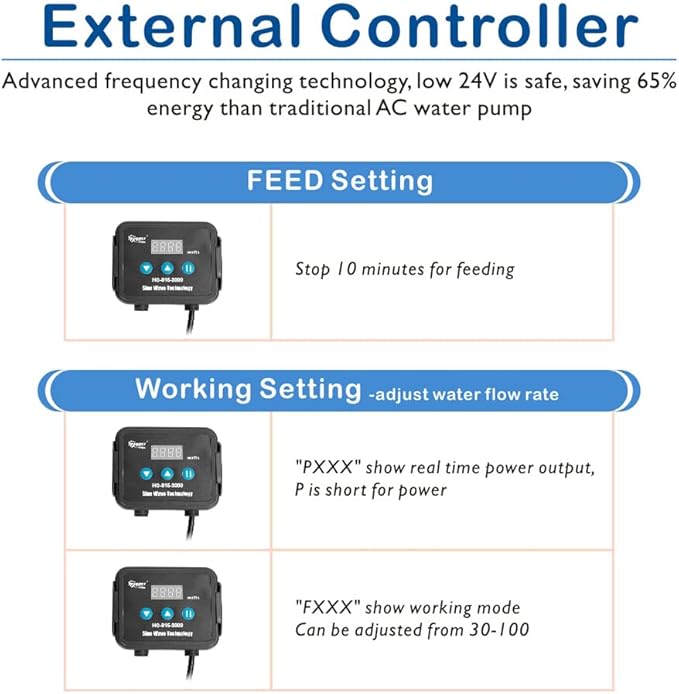 - Easy to Read External Controller - Build in external controller, easy to operate, offers up to 71 speed setting for you to customize water flow and feeding setting ( turn the pump off for 10 minutes for feeding). Easy to read red Led display