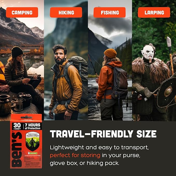 - Powerful DEET Power: Ben's DEET bug wipes offer a potent 30% DEET formula, delivering long-lasting tick and mosquito protection for up to 7 hours