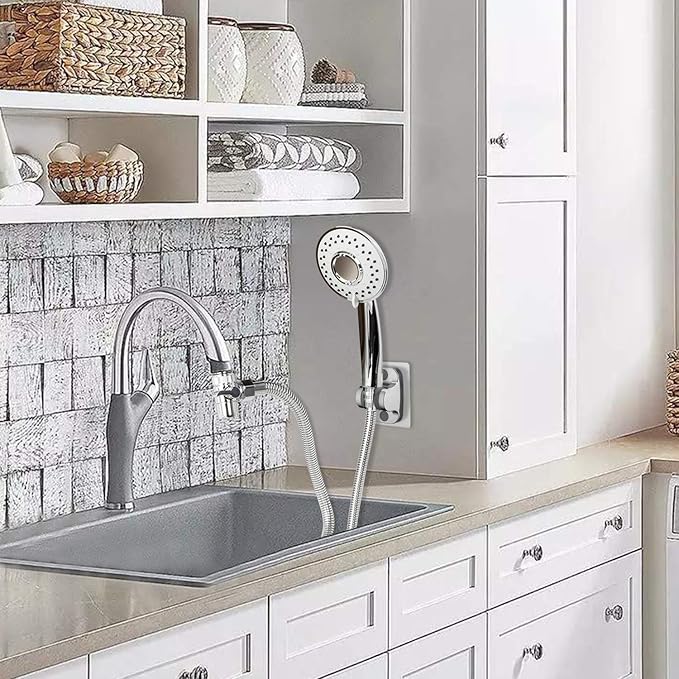 - HOME IMPROVEMENT SET: This faucet hose sprayer attachment add a handheld shower head to your existing sink faucet or tub spouts, extend faucet function. Equipped with 5 adapters fit most of kitchen/bathroom/laundry/utility/basement/Garden/RV faucet that has a removable aerator. If still not fit, please contact us for suitable adapter