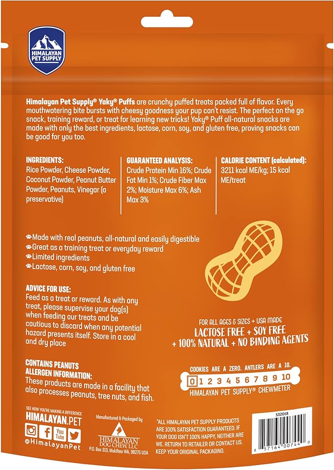 | yakyPUFF Himalayan Cheese Treats | Lactose Free | Gluten Free | Grain Free | USA MADE | For All Breeds | Peanut Butter Flavor Crispy Puffed Treat