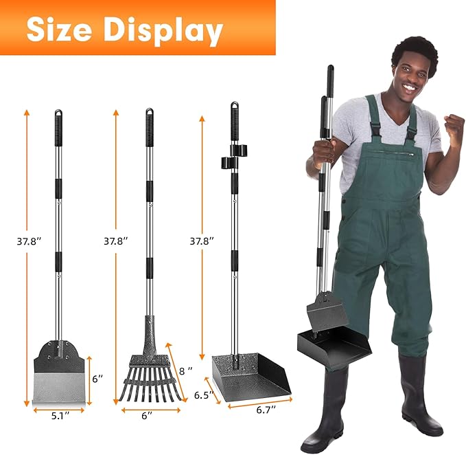 - RUSTPROOF AND EASY TO ASSEMBLY: The surface of dog poop scooper is treated with anti-stick coating, rustproof and anti-corrosion, easy to clean by water. Edges of 3-section handles are round to protect you from getting a scratch while installing, using or picking up.