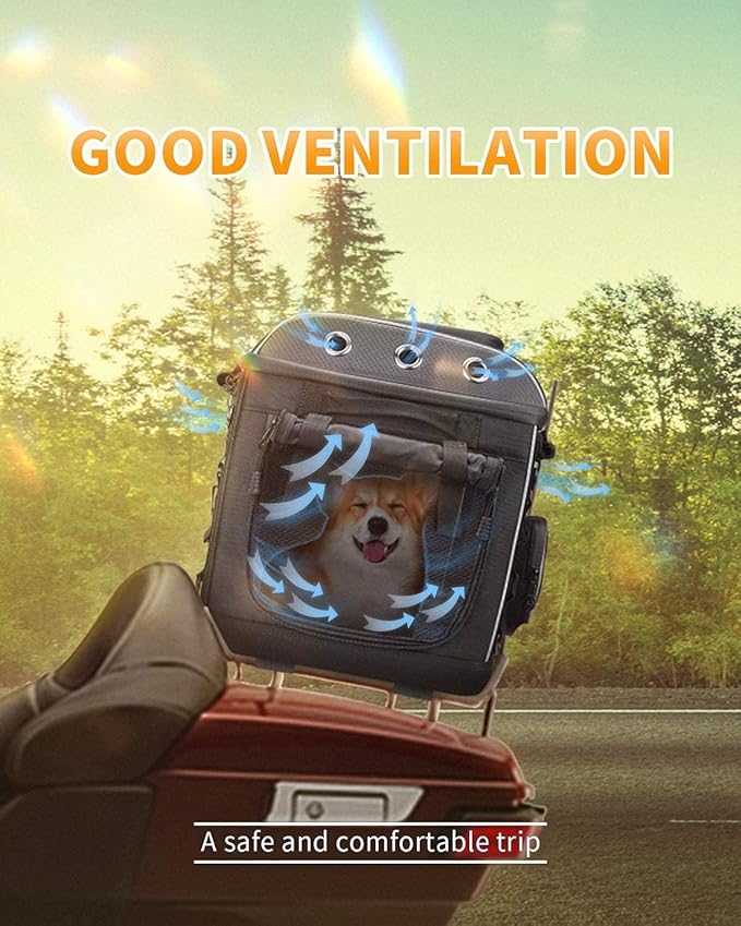 - Breathable Design & Keep Shape - moto pet carrier with 4 Meshes Breathable Panels and access flaps let your lovely guys enjoy the fresh air and riding trip in a safe pet palace. A nice rigid base can protect your buddy well and make a good look on your bike at the same.