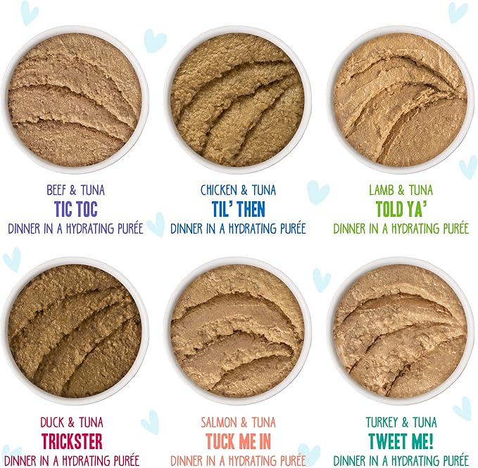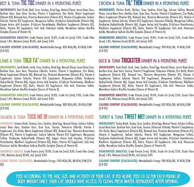 - Variety Pack includes: Chicken & Tuna Til' Then, Salmon & Tuna Tuck Me In, Beef & Tuna Tic Toc, Duck & Tuna Trickster, Turkey & Tuna Tweet Me, & Lamb & Tuna Told Ya