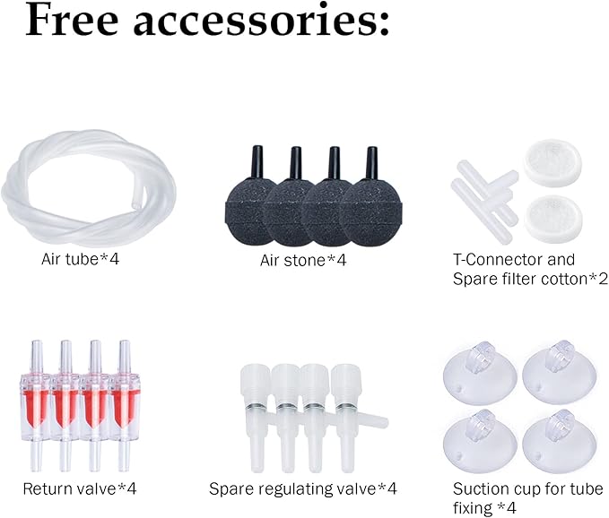 - 【Package Includes】Comes with all needed accessories, includes: Air hose x 4(4.9 FT); Air stone x 4; Check valve x 4; Suction cup x 4; Regulating valve x 4; Air filtering cotton x 2, T connector x 2. Original quality, professional manufacturer.