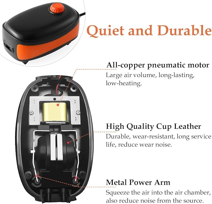 - 【Adjustable Air Volume】 Adjustable fish tank oxygen pump, just adjust the knob gently to get suitable air volume. High frequency all-copper pneumatic motor, accurate electronic adjustment, with high efficiency air stone, produce more bubbles, more stable and safer oxygen delivery.