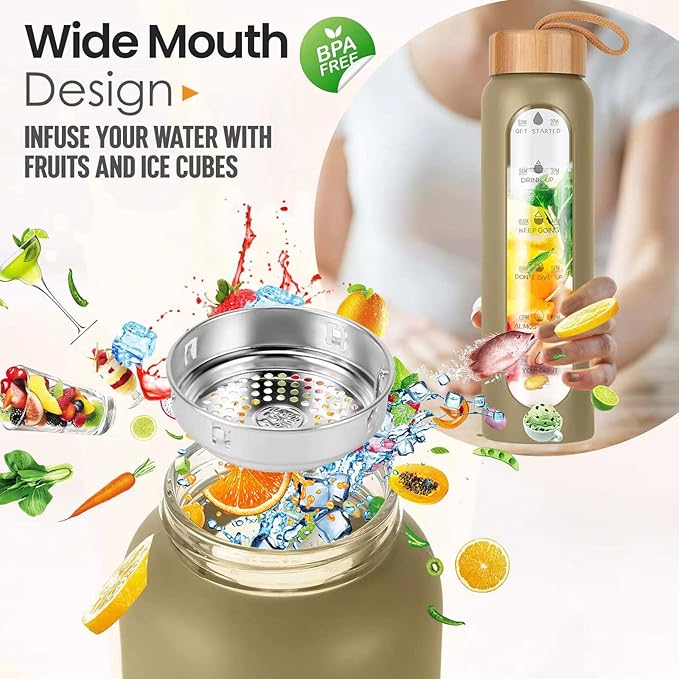 Aqulea Glass Water Bottles with Silicone Sleeve - BPA Free Reusable Wide Mouth Glass Motivational Water Bottles with Fruit Infuser – Leak Proof Borosilicate Water Bottle with Time Marker
