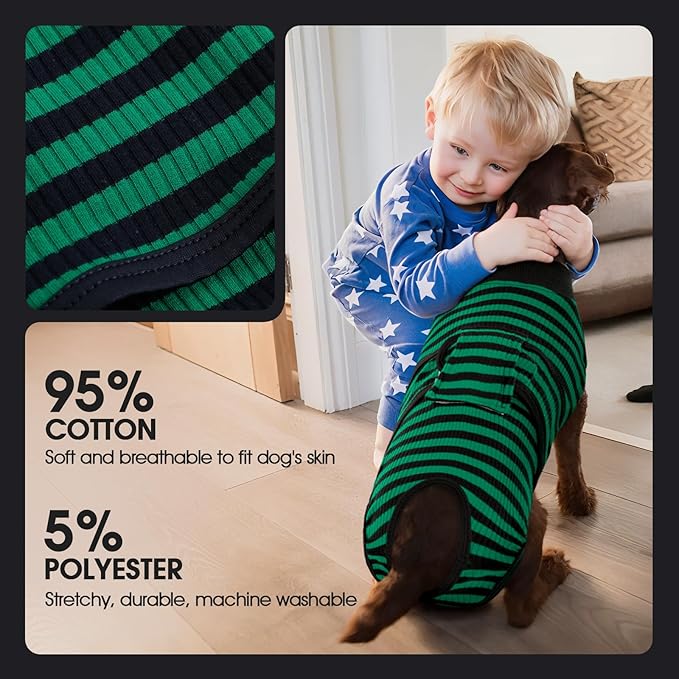 - [BREATHABLE FABRIC]: Our dog recovery suit is made of 95% cotton and 5% spandex. The recovery shirt is highly elastic and breathable, allowing the dog to feel comfortable and move freely after wearing it. No deformation after machine wash.