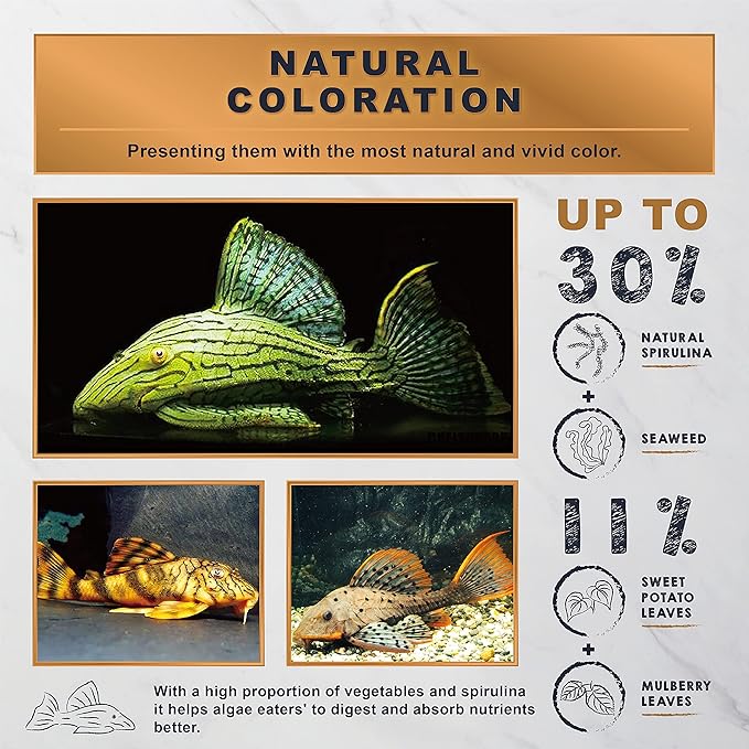 - ✅ ALL NATURAL FLAVOR Formulated with high content of natural spirulina, seaweed, sweet potato leaves, mulberry leaves, wild sword prawns, garlic and a variety of carefully selected natural ingredients that delivers superb palatability and well balance nutrients for algae eaters. Even the pickiest ones can't resist it!
