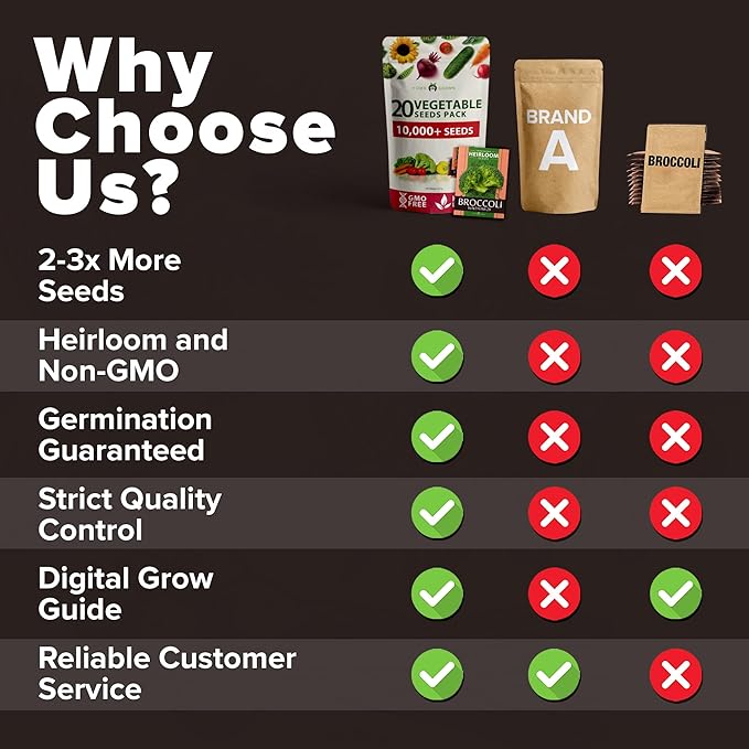 - 10,000+ PREMIUM QUALITY SEEDS. With over 10,000 seeds in total, this collection offers incredible value for gardeners looking to grow year-round. Enjoy a wide range of vegetables from fast-growing radishes and peas to full-season corn and broccoli.