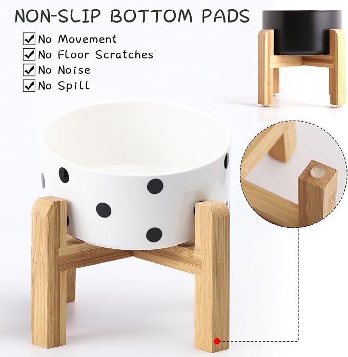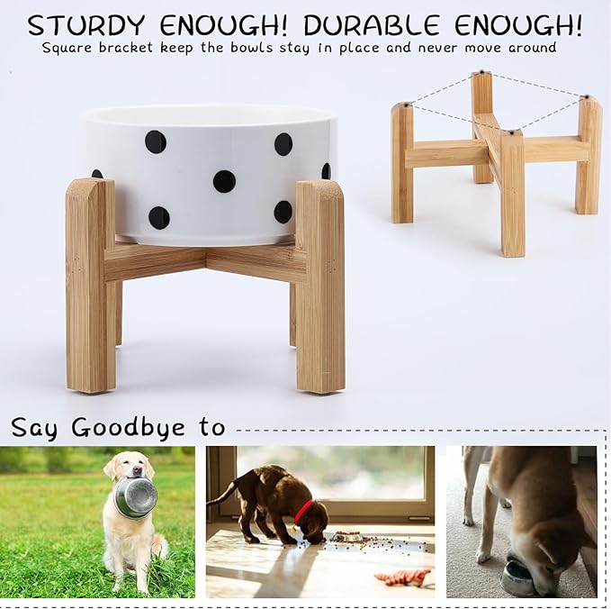 - NON SLIP WOOD STAND -You can get two different heights by flipping the bamboo stand,the elevated ceramic medium size pet bowls are perfect for small and medium dogs from different stages of childhood to adulthood, The wood stand on the bowls stopping ceramic dog bowl from sliding around, Keeps pet food and water in the bowls.