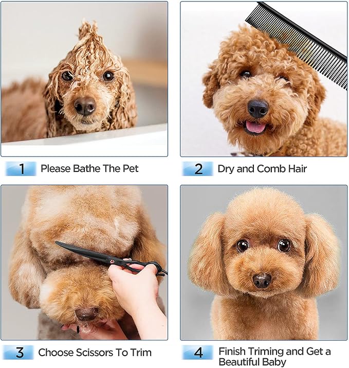 - 【6 in 1 Dog Grooming Scissors Set】The dog grooming scissors set comes with 1 straight scissors, 1 thinning scissor, 2 curved scissor, 1 grooming comb and 1 storage case