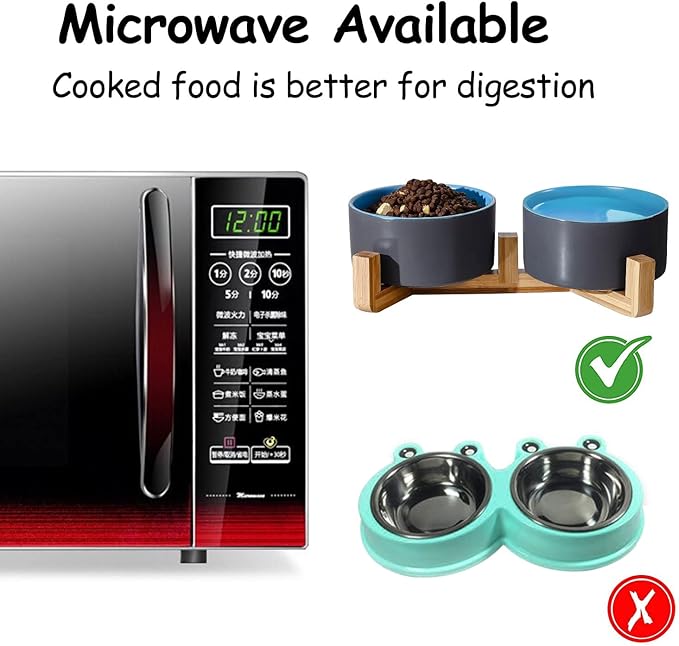 - Double Bowl Design - One bowl for food and one for water for dogs or cats , Each cat dog ceramic bowl has a Unique bamboo stand, raising the dishes closer to your pet for more comfortable eating.