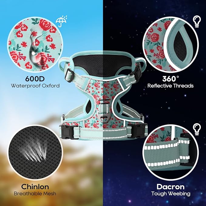 - 【MUCH SAFER & MORE COMFORTABLE】 Breathable mesh lining with soft sponge padding plate of puppy harness prevents injuries, giving extra comfort and protection with enhanced 1600D oxford fabric. The reflective material will be really nice when it gets dark. Also, your dog will be saw easily. This reflective material can make drivers have long time to react, which ensure your dog’s safety!