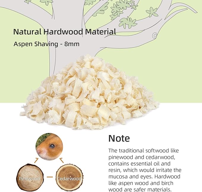 - [Soft Texture & More Comfortable] Niteangel tiny pet aspen bedding is made from natural Aspen wood and safe for small pets. The soft fluffy texture allows your critters to play freely on the aspen shavings bedding. The small pet bedding is not only good at absorbing the annoying smell of the cage, but also gives the hamster a natural and comfortable habitat.