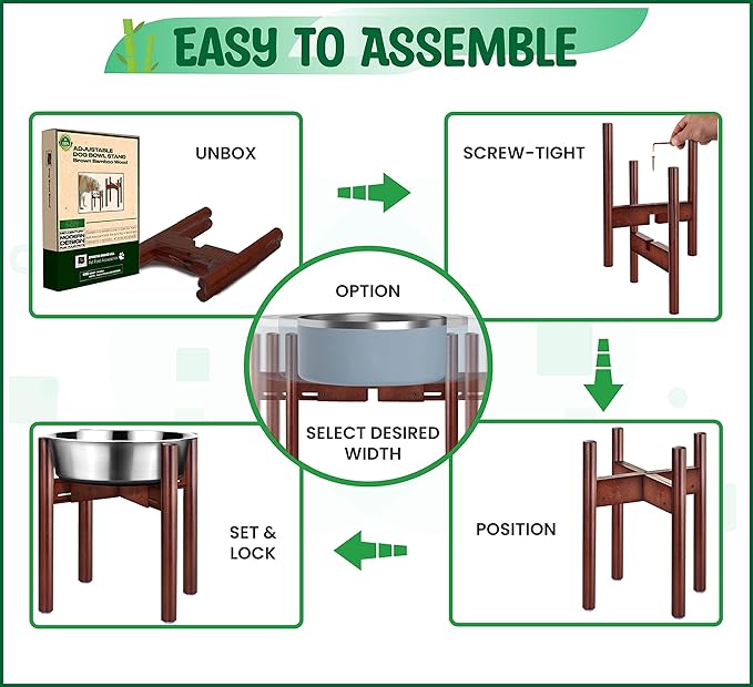 - Easy Assembly in Minutes – This water bowl stand sets up in just a minute. Stack the two parts and tighten with the screw. Place the dog water bowl of your choice on top of the platform and adjust the legs close to the bowl. When the stand perfectly fits the bowl, lock the rails with the bolts and nuts. Its now ready to add dog food or water to the feeder.