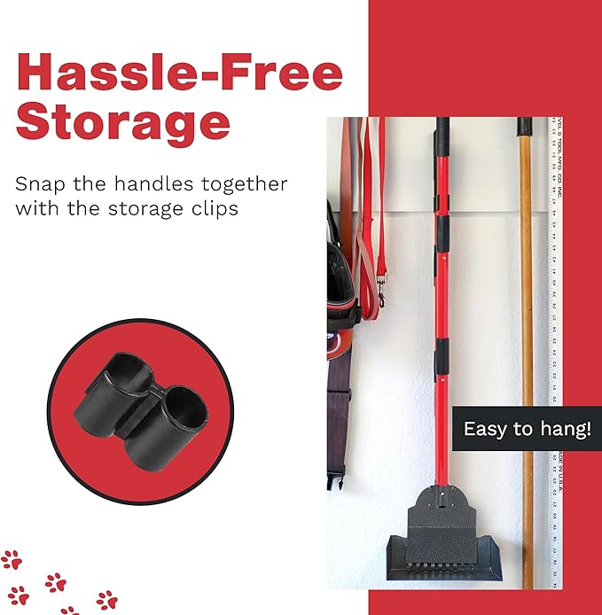 - Easy assembly, simple storage - Assembling the pooper scooper for medium dogs is a breeze out of the box and is as simple as a push and click. No extra tools needed! Push-pin installation adds extra durability compared to twist installation that unravels with use. Use the holes in the handle grip to store on the wall in your garage or tuck it away neatly in a backyard corner for convenient access.