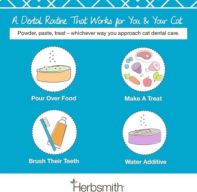 - SIMPLE, NATURAL INGREDIENTS - We use 100% all-natural ingredients to equip you with the highest quality dental product for your cat. With a blend of sea algae, spearmint, and parsley, this powder coats your kitty’s teeth and gums and springs into action for long-term dental health.