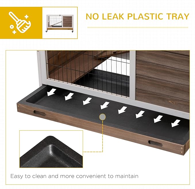 PawHut Wooden Rabbit Hutch Indoor Outdoor, Elevated Bunny Cage with No Leak Tray Enclosed Run with Wheels, Ideal for Guinea Pigs and Small Animals, Brown