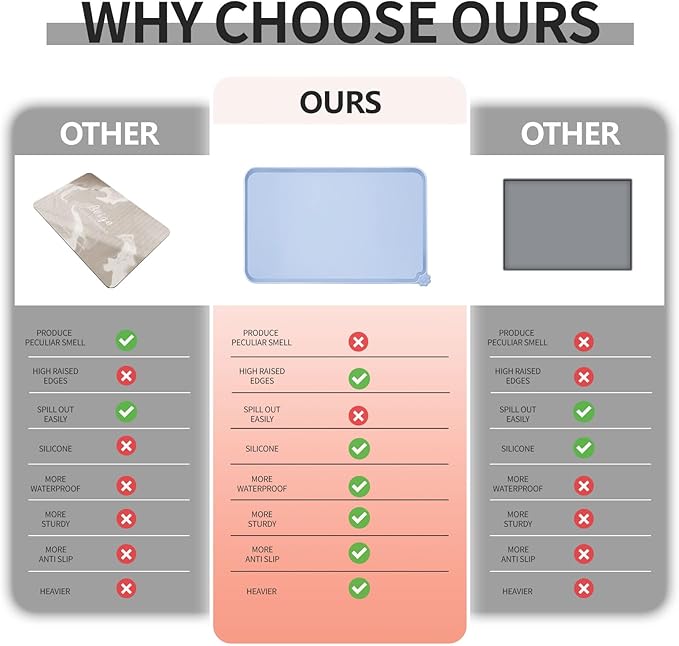 - Various sizes available: our pet mats come in 5 different sizes - 18.5" x 11.5", 22" x 14", 24" x 16", 28" x 18", and 32" x 24". Suitable for all kinds of pets, from puppies to large pets, choose the perfect size for your furry friends and avoid messy spills at mealtime