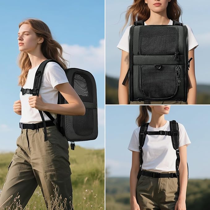 - BETTER CONSTUCTION-Well ventilated design for optimal airflow, two-way entry for easy access, top mesh window for more headroom and visibility, and thick, soft fleece bedding for your pet resting and relaxing. This backpack is firmly structured, providing ample room for your pet to move around.