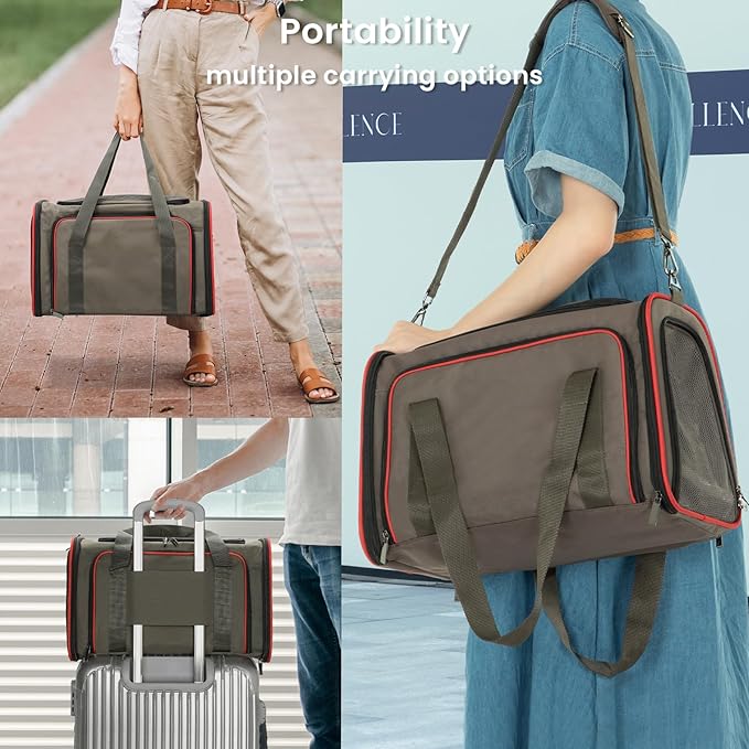 - 【COMFORTABLE SPACE】The pet carrier extra extended space enable pets sprawl out, lay, see all around and relax when you have a airline trip/car travel/long travel/vacation/leisure, also works great in the car, roomy and they lay in it like a bed. Carrier can be folded totally flat when not in use.