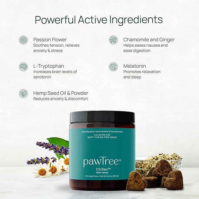 pawTree Chillax - Natural Calming Hemp Chews. Veterinarian-Developed Formula Helps Relieve Stress and Tension, Separation Anxiety and Soothe Fear from Storms - Large Soft Chews for Dogs (60 Count)