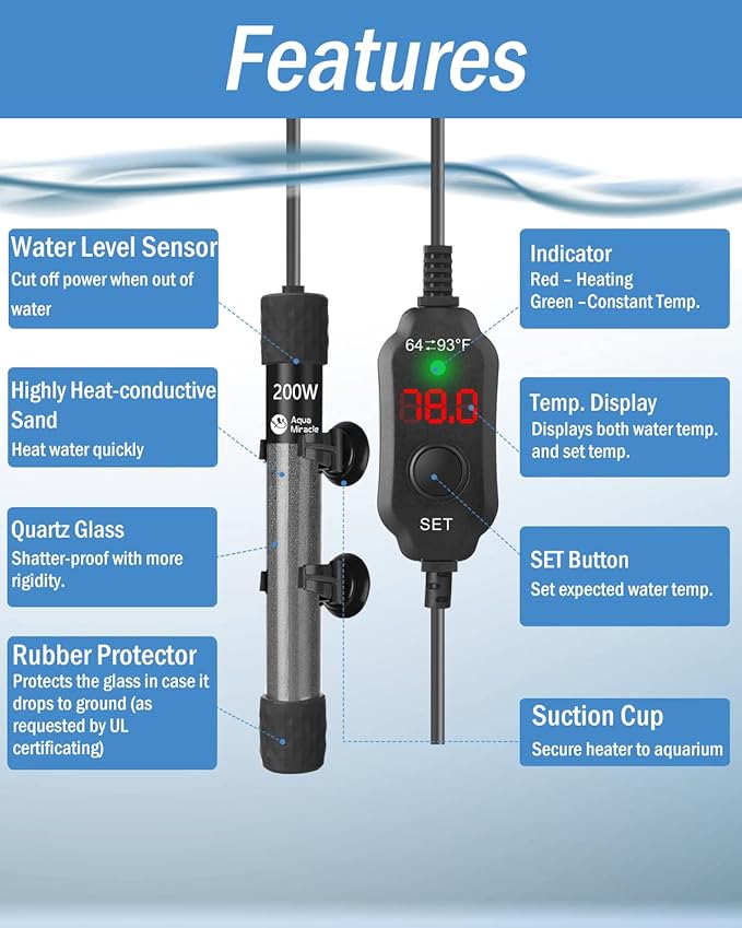 - DRY RUN / OVERHEATING PROTECTION – Full consideration of safety. With the multiple protections this fish tank heater will stop working when the water level is lower than the minimum water level (DRY RUN PROTECTION) or when the water temperature exceeds 97F (OVERHEATING PROTECTION). You are free from “cooking fish”!