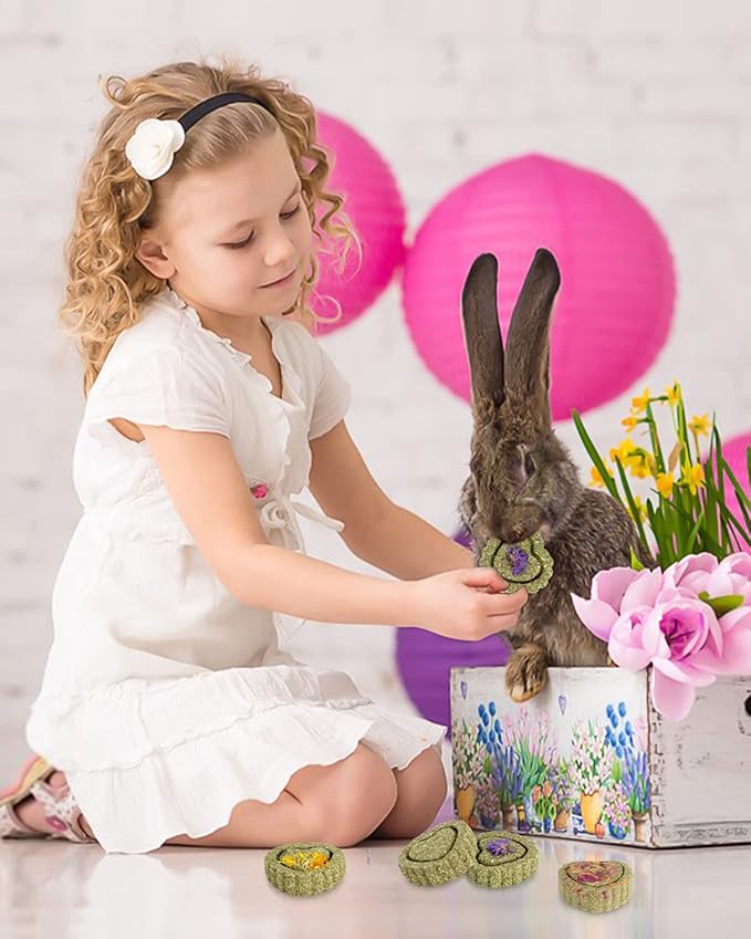- 12PCS TIMOTHY TREATS: This set of timothy hay treats includes 4 different flavors: 3 original timothy hay cakes, 3 rose timothy hay cakes, 3 myosotis timothy hay cakes and 3 calendula timothy hay cakes.