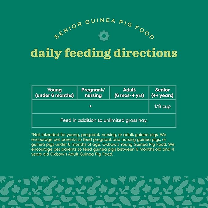 - SENIOR GUINEA PIG FOOD: Designed for senior guinea pigs aged 4+ years, our guinea pig food marries nutrition and taste perfectly; Artfully crafted with timothy, orchard, and oat hay, ensuring a high-fiber diet for your cherished pet's healthy life