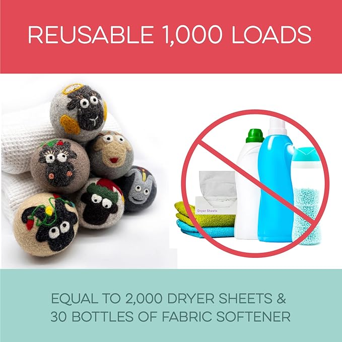 - REUSABLE FOR 1000+ LOADS – REDUCE WASTE: Why keep buying disposable dryer sheets? These cute dryer balls last 1000+ loads, replacing 2000 dryer sheets or 30 bottles of fabric softener. Fluff Ewes dryer wool balls laundry reusable deliver a cost-effective solution for 2-4 years of hassle-free laundry. Make a smarter choice for your wallet and the environment.